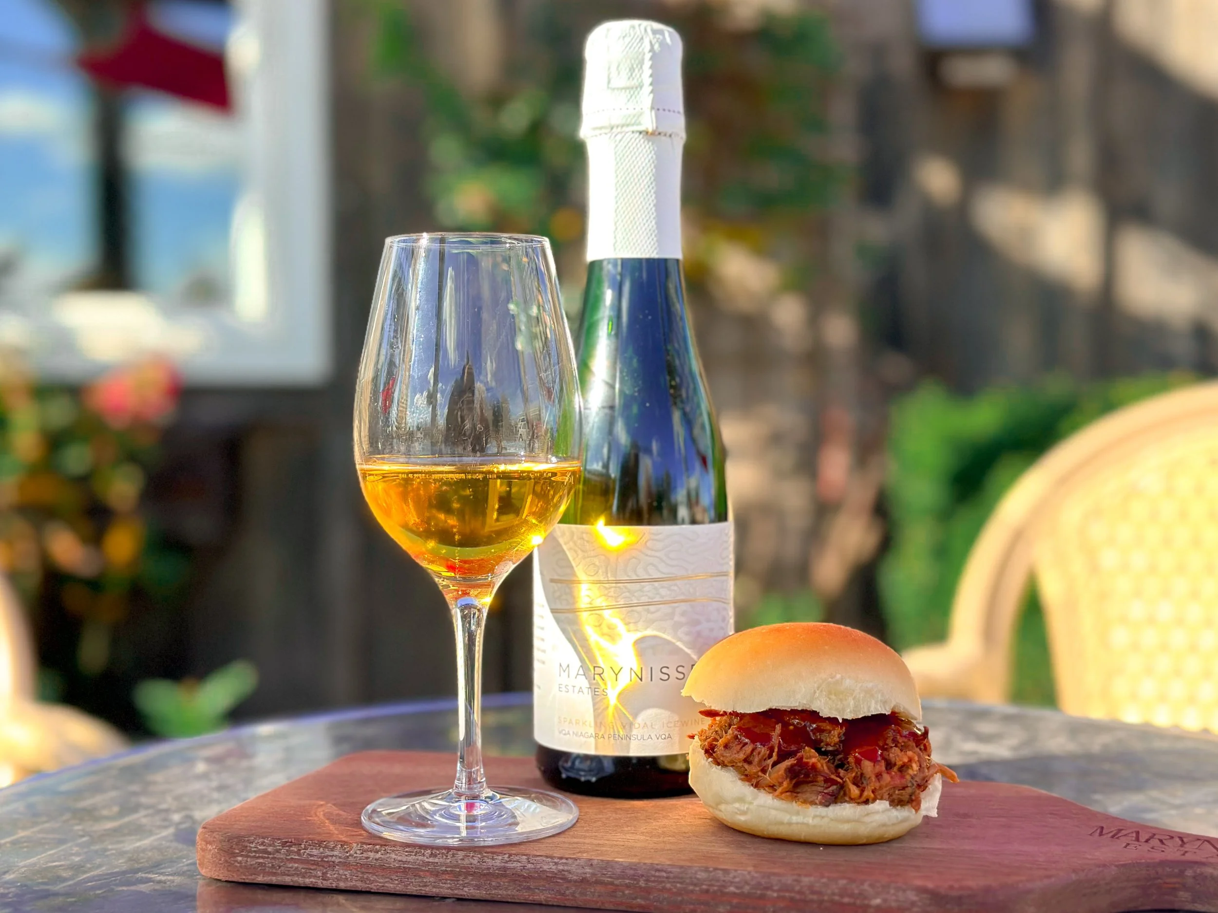 A bold East-meets-Niagara pairing - our 2023 Riesling Icewine’s honeyed citrus elegance meets Chinese-inspired porchetta stuffed with hoisin and black bean paste, topped with pear slaw, yuzu mayo, and crisp spicy pork skin.