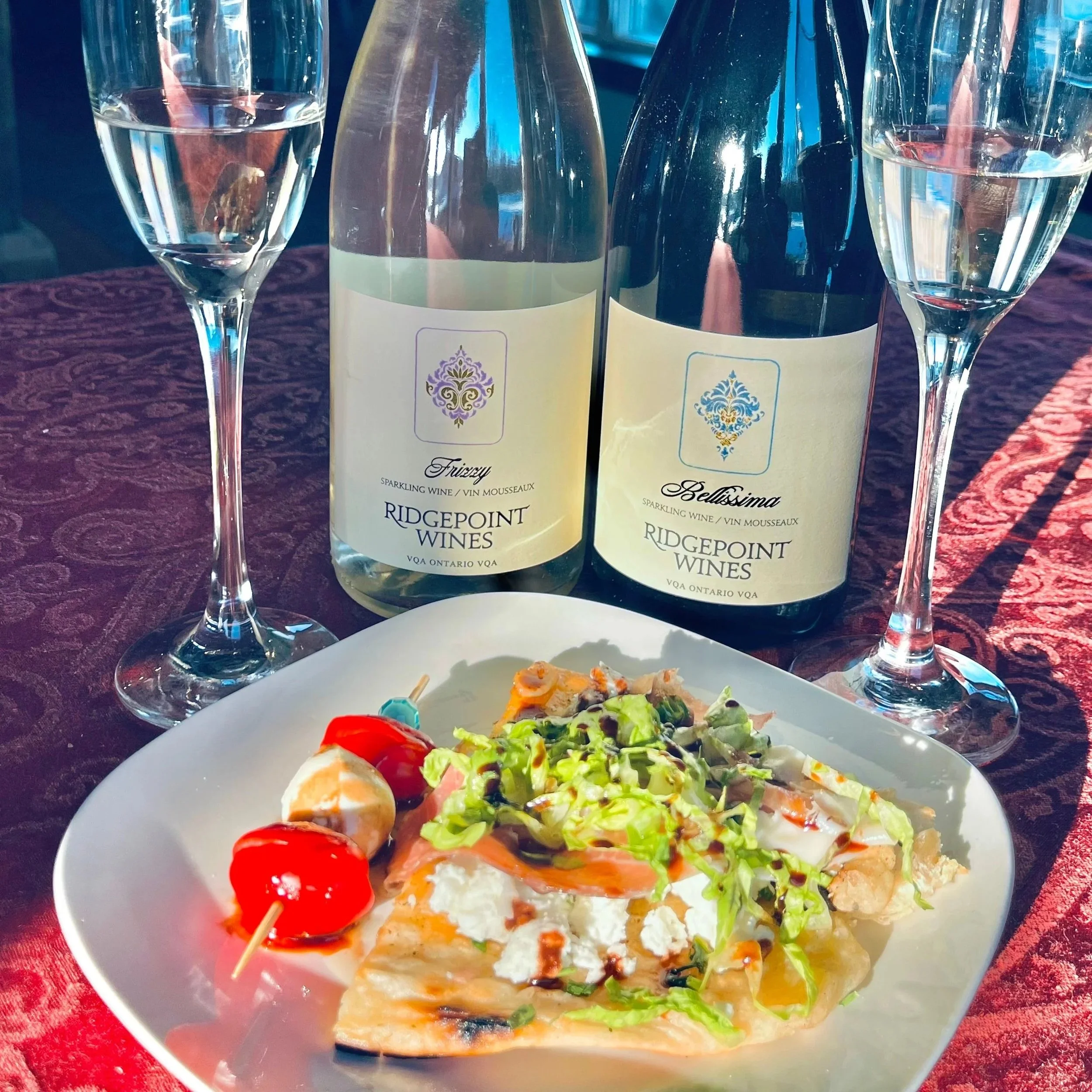 Our Bellissima and Frizzy Sparkling wines, featuring the Prosecco grape, paired with a flatbread topped with goat cheese, arugula, and prosciutto and a caprese skewer of cherry tomatoes and bocconcini cheese finished with a balsamic glaze. Cin Cin!