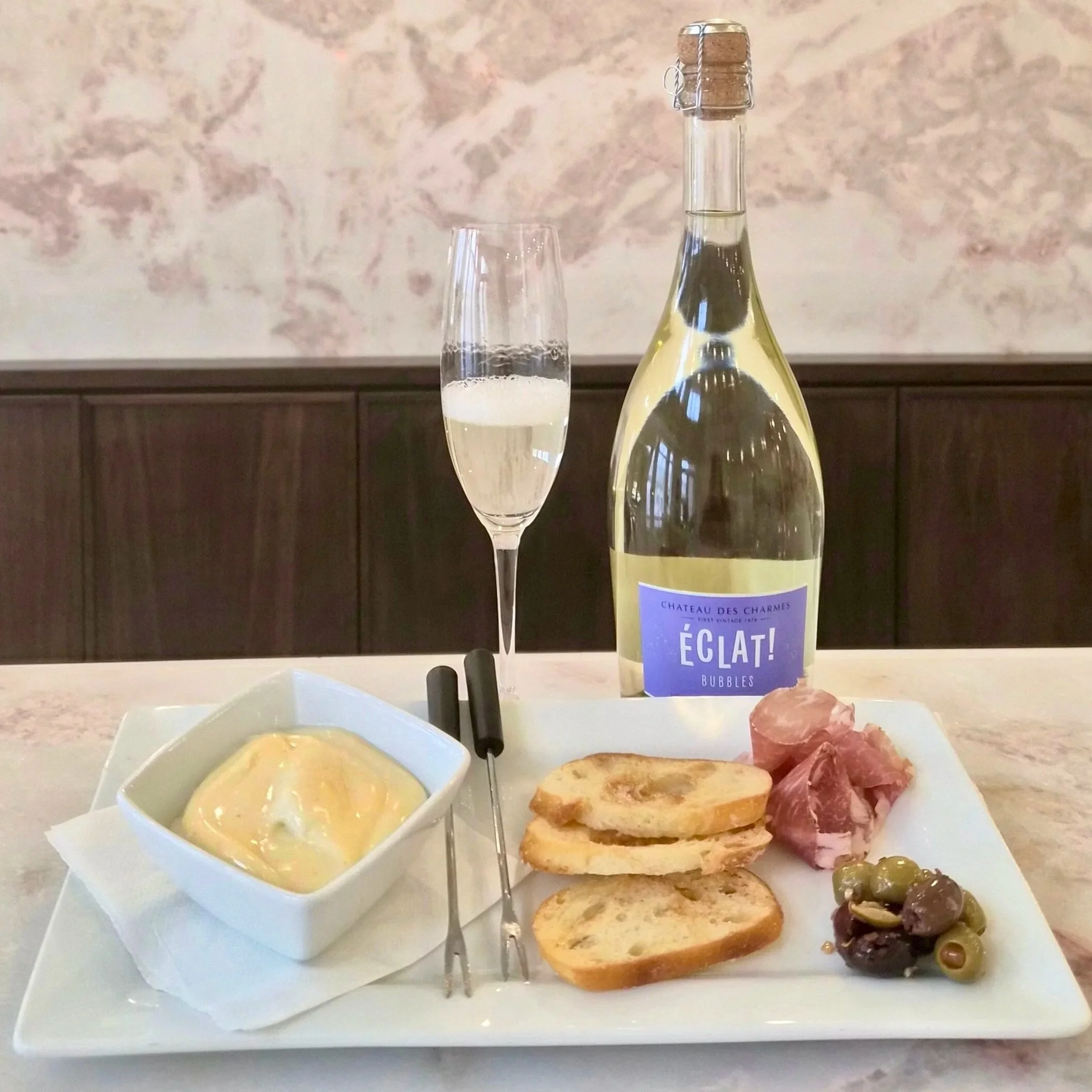 Chateau des Charmes sparkling wine combined with Gruyere cheese. Served with sourdough, marinated olives, and capicola.