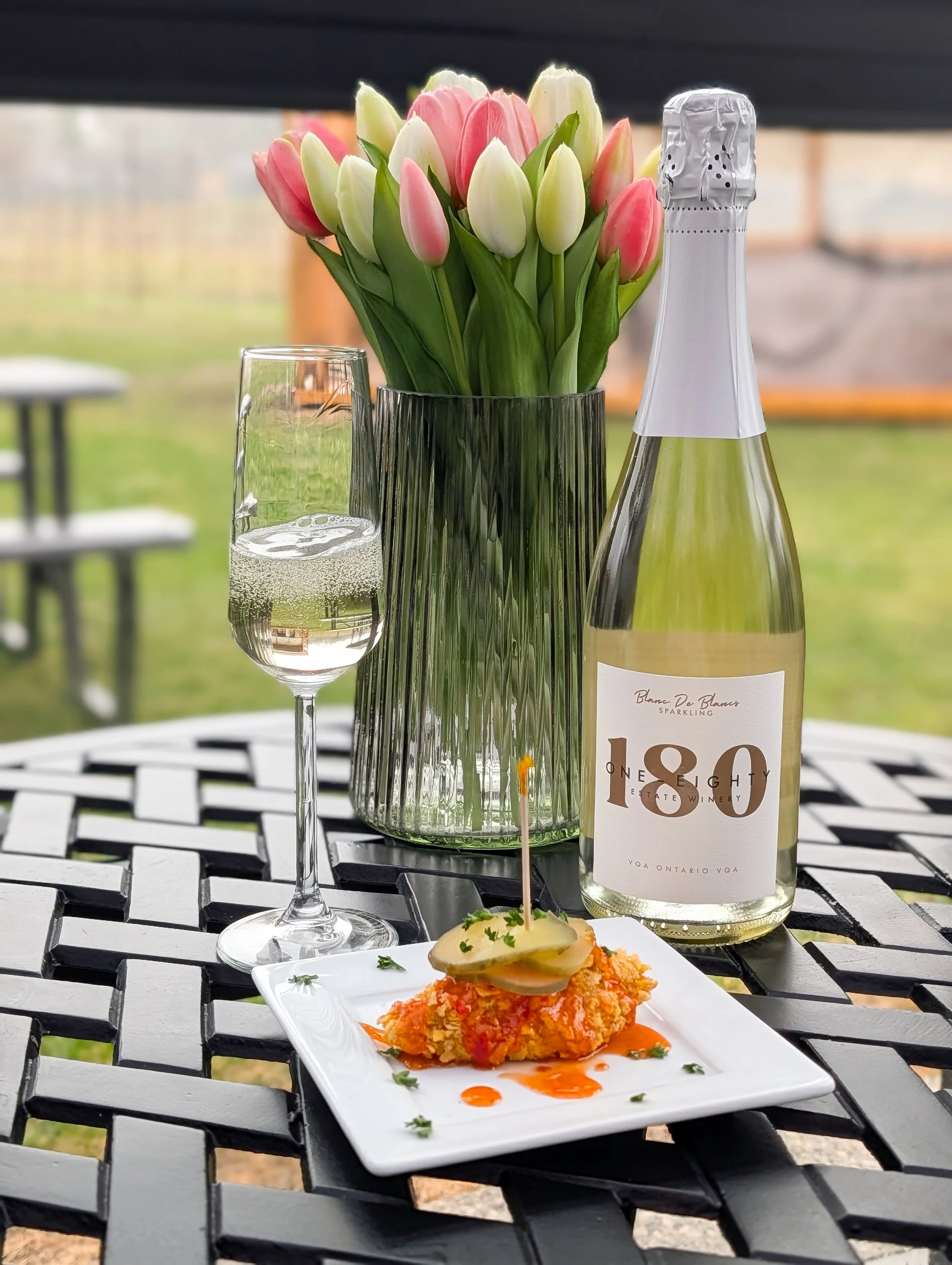 Our bright, elegant Blanc de Blancs wine is perfectly paired with a golden, crispy fried chicken bite topped with Sweet Thai Chili sauce. The wine's bright citrus notes and fine bubbles cut through the crunch and gentle heat. Don't miss out on this lively pairing that balances richness, spice, and refreshing acidity!